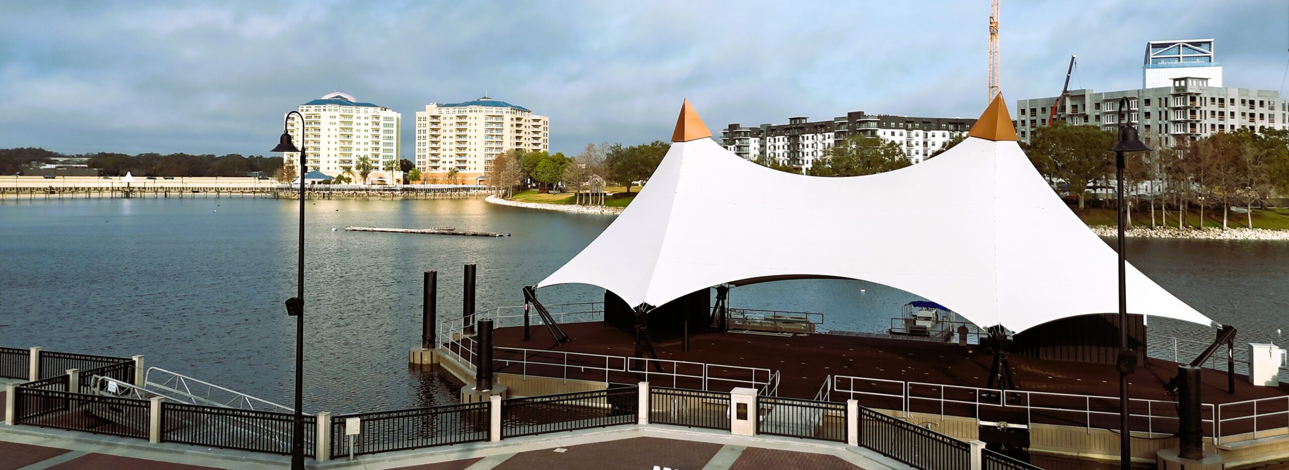 An original Birdair PVC structure back in 1995, Cranes Roose Park's floating stage shade structure was recently replaced with durable and long-lasting PTFE-coated fiberglass membrane. In addition to the floating stage, Birdair also retrofitted the gazebo boardwalk PVC structures as well as the restroom and ranger structures with PTFE membrane. Note the cobblestone-style pathways, ionic columns, gathering areas with seating, themed lighting fixtures all ready for leisurely strolls, listening to music, or just enjoying the beauty of the park. Cranes Roost Park is Central Florida’s premier outdoor event venue with weekly, monthly and annual events.
