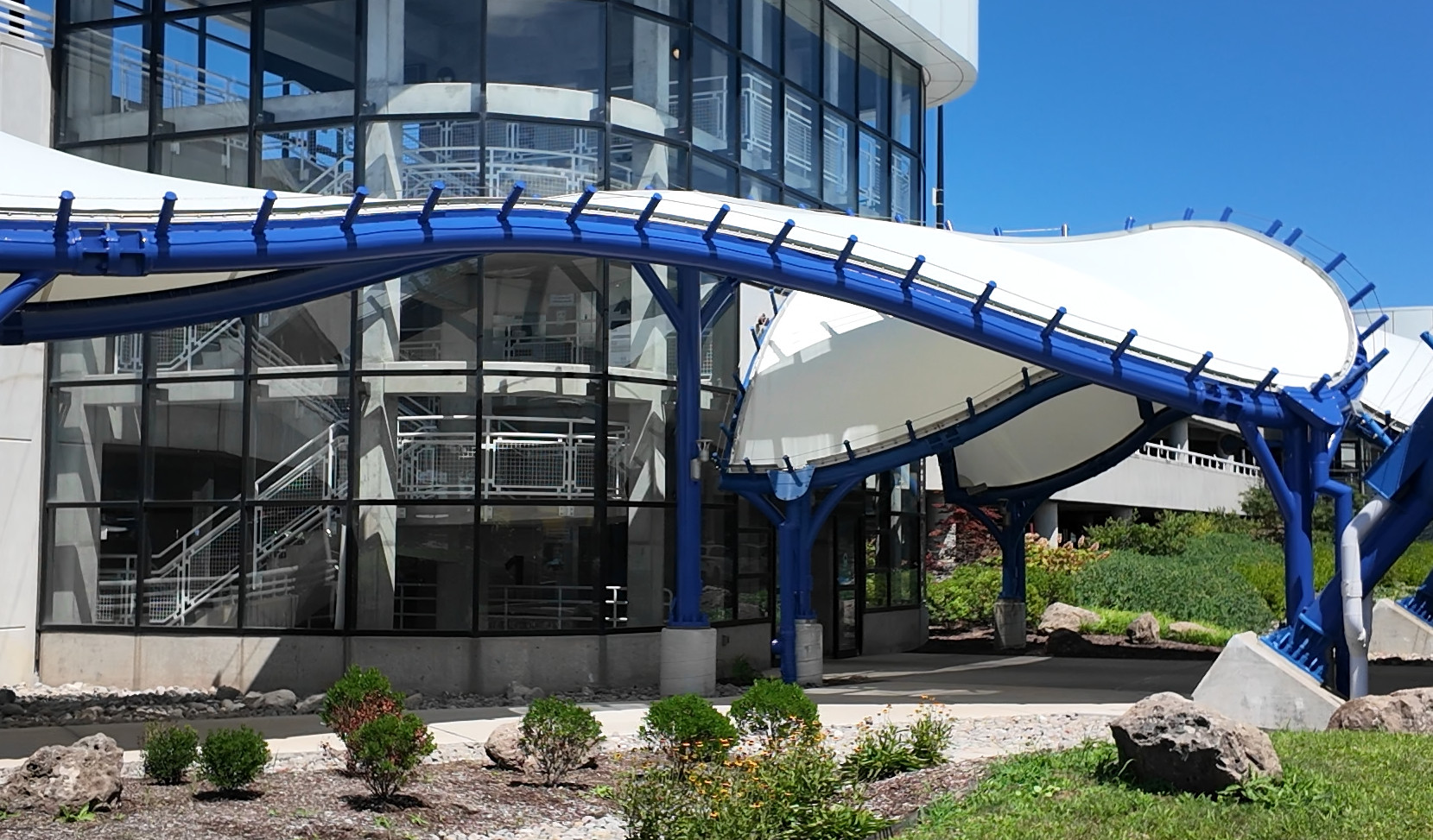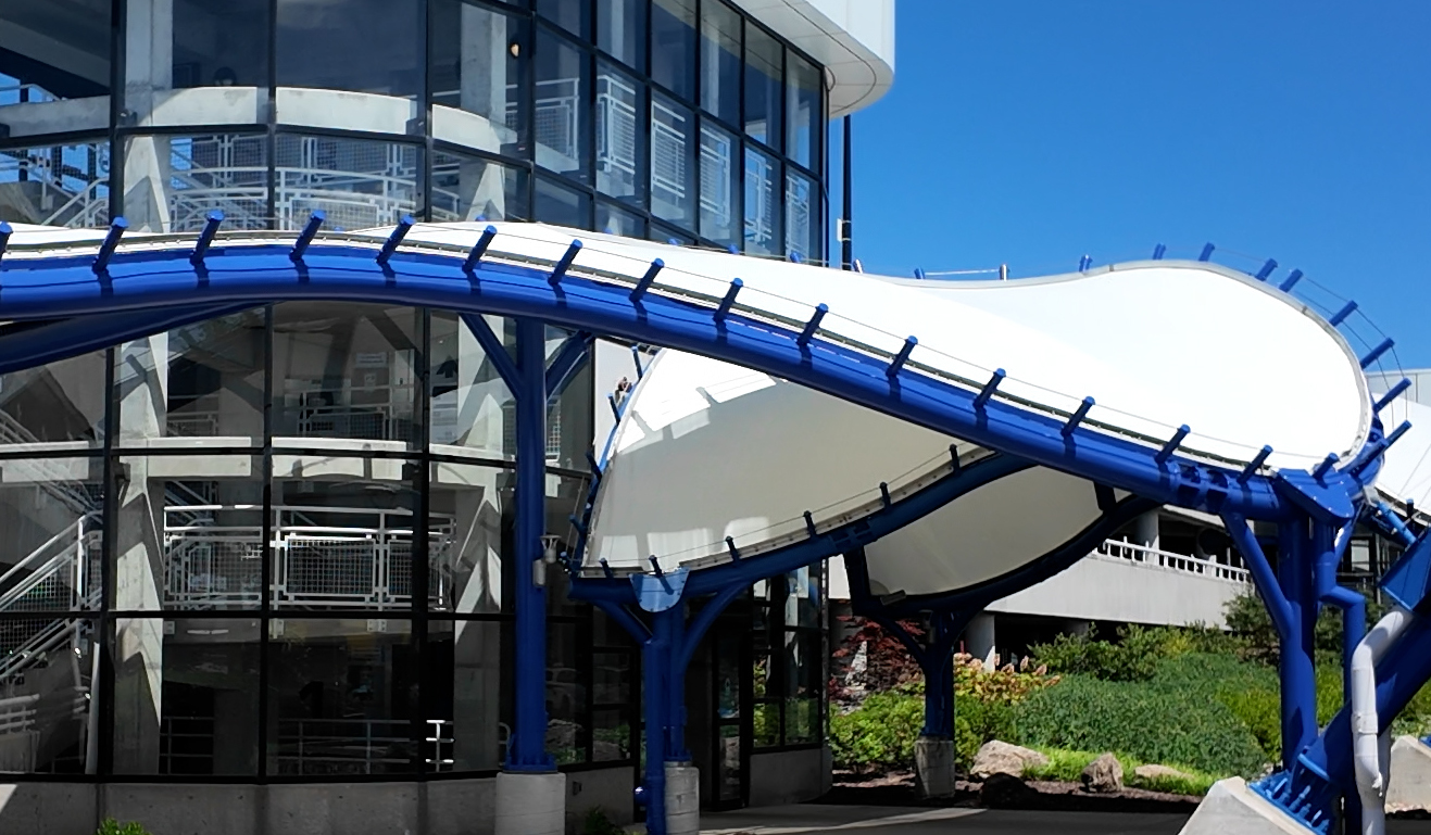 Birdair expanded the tensile architecture theme at the Frederick Douglass Greater Rochester International Airport with the design and construction of two additional PTFE-coated fiberglass membrane walkway canopies. These wave-like structures add approximately 3,000 square feet of covered space, extending the airport’s existing tensile architecture theme. Featuring vibrant blue painted steel framing with perimeter snow break details and durable white translucent PTFE membrane, the canopies deliver both striking visual impact and reliable weather protection. The design enhances the airport’s architectural identity while ensuring a more comfortable, sheltered experience for travelers—rain or shine.