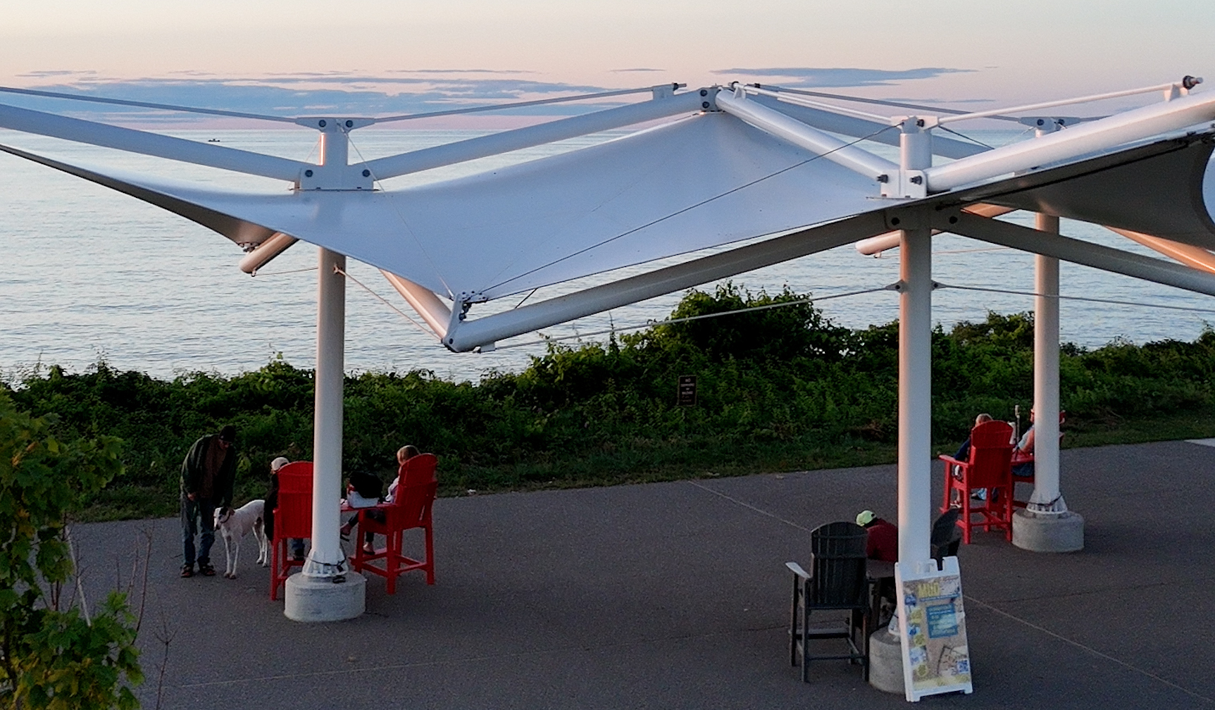 In 2023, Birdair fabricated and installed a series of striking PVC membrane modular canopies at Sandbar Park in Webster, NY, just outside of Rochester. These structures are part of our Quasar design line—square in plan with a distinctive hyperbolic paraboloid shape that offers both visual appeal and functional shade. Each modular canopy is custom-engineered to meet specific design load criteria, ensuring strength and stability in a variety of conditions. As a full design-build solution from the base plate up, Birdair’s modular systems offer flexibility, durability, and a clean architectural aesthetic that complements the park’s waterfront setting.
